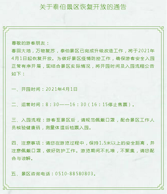 关于泰伯景区恢复开放的通告