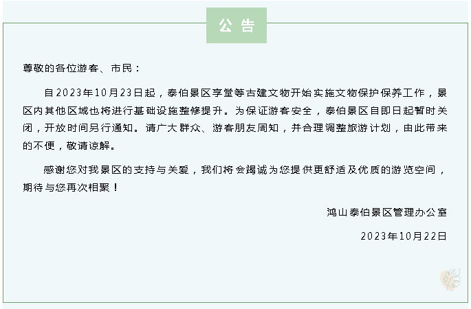 泰伯景区闭园公告